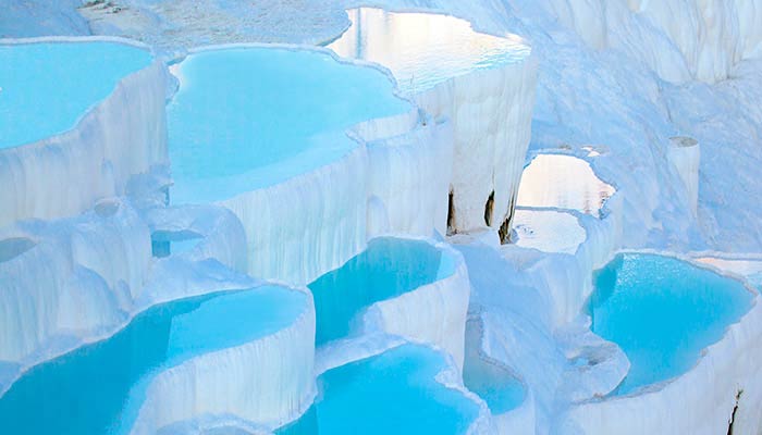 Desayuno y salida para Pamukkale (610 km). En el camino, parada para visitar el Caravanserail de Sultanhan posada Selyúcida de la era medieval. Continuación para Pamukkale. Tiempo libre en Pamukkale "Castillo de Algodón", único en el mundo con sus piscinas naturales de aguas termales calizas y las cascadas petrificadas de travertino. Cena y alojamiento en el hotel.